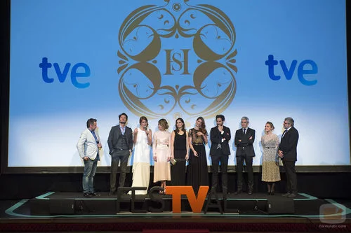 El equipo de 'Seis hermanas', junto a la productora Teresa Fernández-Valdés, posan frente al público minutos previos al preestreno de su serie en Murcia.
