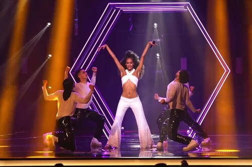 La artista Sara Deop interpreta su tema "Make you say" en la Semifinal 2 del Benidorm Fest junto a sus bailarines.