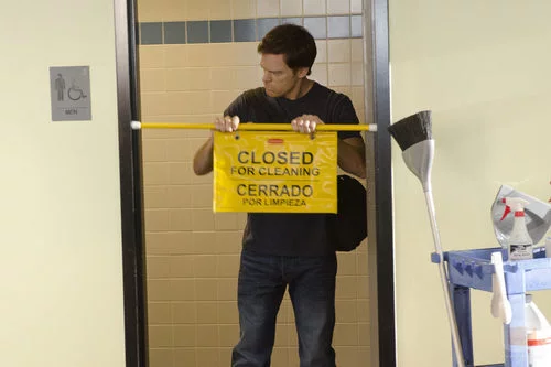 El actor Michael C. Hall que da vida a 'Dexter' intenta entrar un baño del aeropuerto en la séptima temporada.