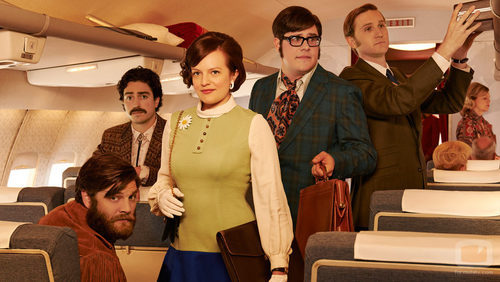 Equipo de copywriters de compañía Sterling Cooper y asociados: Stan Rizzo (Jay R. Ferguson), Michael Ginsberg (Ben Feldman), Peggy Olson (Elisabeth Moss), Harry Crane (Rich Sommer) y Ken Cosgrove (Aaron Staton).