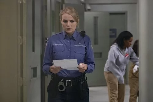 La actriz Emily Tarver vestida de guardia durante la grabación de la séptima temporada de 'Orange is the New Black' donde interpreta a Artesian McCullough.