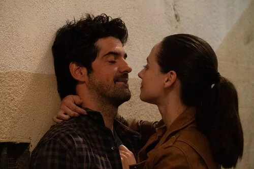Daniela (Elena Rivera) y Óscar Santos (Miguel Ángel Muñoz), a punto de besarse durante una de las escenas de 'Sequía', la serie de RTVE.
