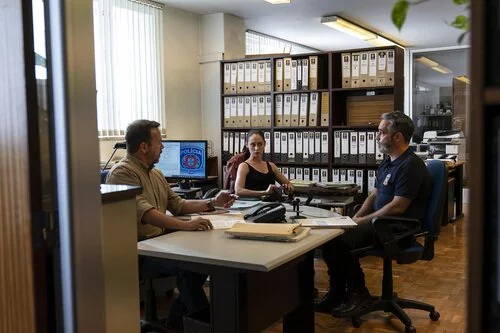 Marco D'Almeida y Elena Rivera en una escena de un interrogatorio en 'Sequía'