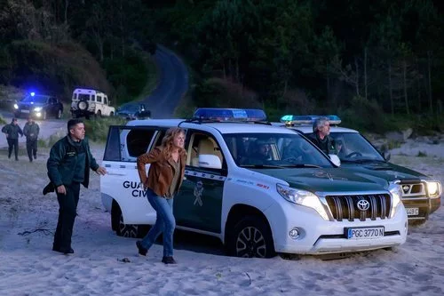 Mónica (Emma Suárez) y la Guardia Civil aparcan en la playa en 'Néboa'
