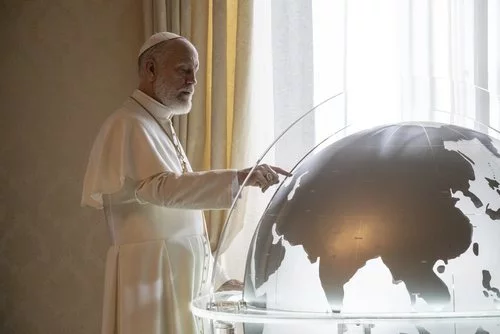 John Malkovich apoya su dedo índice sobre un globo terráqueo en 'The New Pope', la miniserie que llega a España de la mano de HBO.