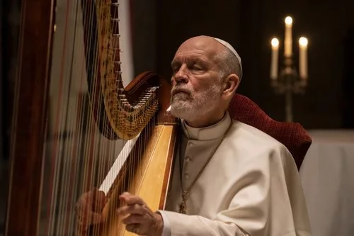 El veterano actor se relaja tocando el arpa en una escena de 'The New Pope', que sigue los eventos de 'The Young Pope' desde un diferente punto de vista.