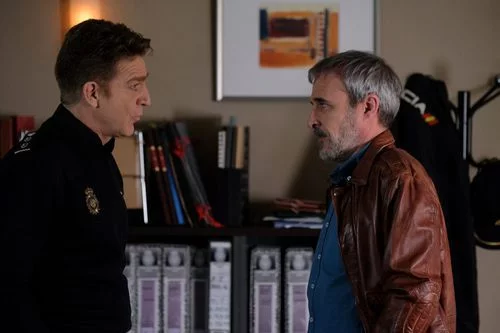 Emilio Bremón conversa con su compañero en la serie policíaca de la cadena pública española 'Servir y proteger'.