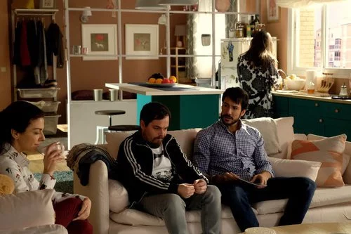 Jimmy Barnatán y Alejandro Albarracín, uno de los nuevos fichajes, en el sofá de una casa en una escena de la segunda temporada de 'Servir y Proteger'.