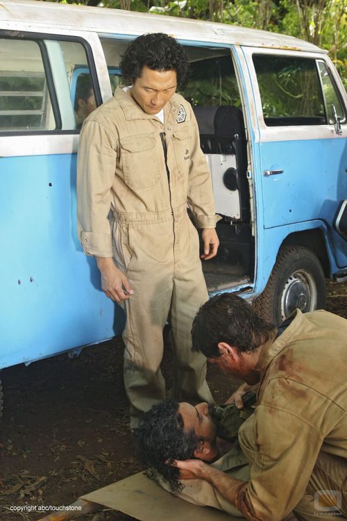 Jack da de beber de una cantimplora a Sayid que se debate entre la vida y la muerte. Atento a lo que ocurre y de pie, Jin.