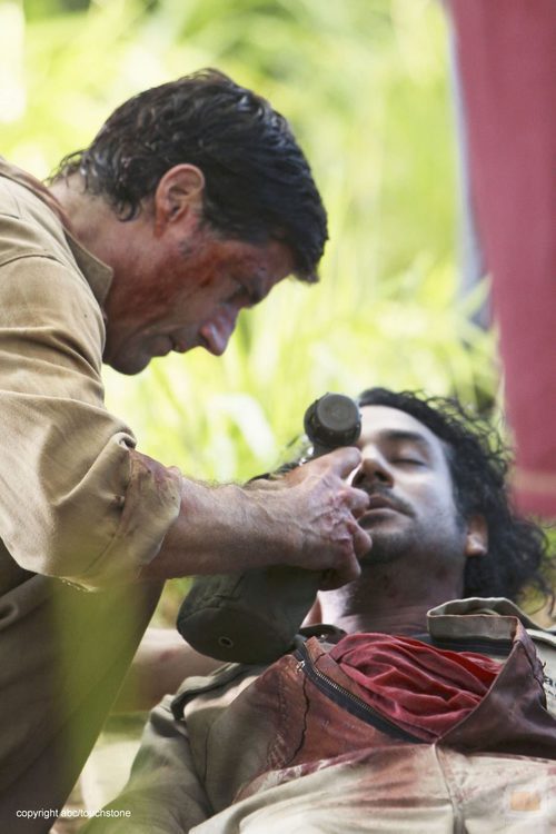 Jack, cantimplora en mano, salvar a Sayid que lleno de sangre permanece tumbado mientras agoniza