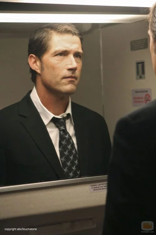 Foto del capítulo 'LA X' de la sexta temporada de 'Perdidos' cuando Jack Shephard se está mirando enfrente del espejo del avión en el que vuela.