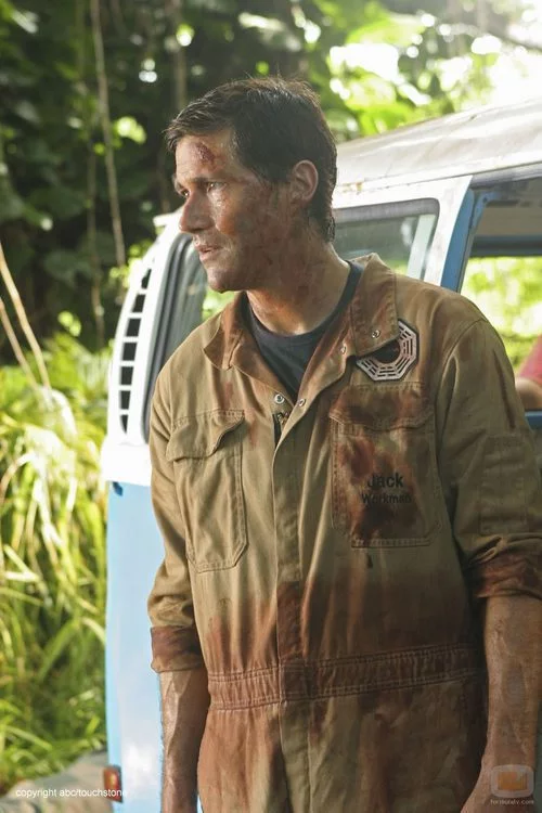 Matthew Fox actor que da vida a Jack en 'Lost' con el mono marrón teñido de rojo por la sangre de Sayid, al que intenta salvar.
