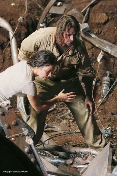 Un Sawyer ensangrentado y sucio mira atento delante ante una Kate que parece alertarle de un peligro.