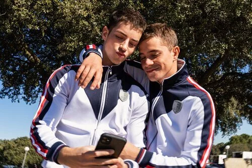 Patrick Blanco e Iván Carvalho, interpretados por Manu Ríos y André Lamoglia, haciéndose una fotografía en la serie de Netflix producida por Zeta Studios.