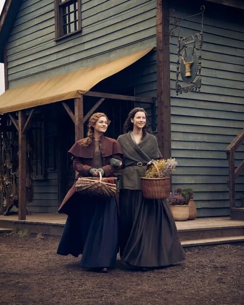 Las actrices Caitriona Balfe y Sophie Skelton, posan felices con unas cestas mientras encarnan a Claire y Brianna Fraser.