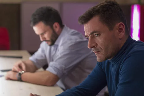 Marcell en primer plano, sentado a la mesa con los brazos sobre ella y actitud pensativa. Al fondo, Carlos manipulando su reloj.