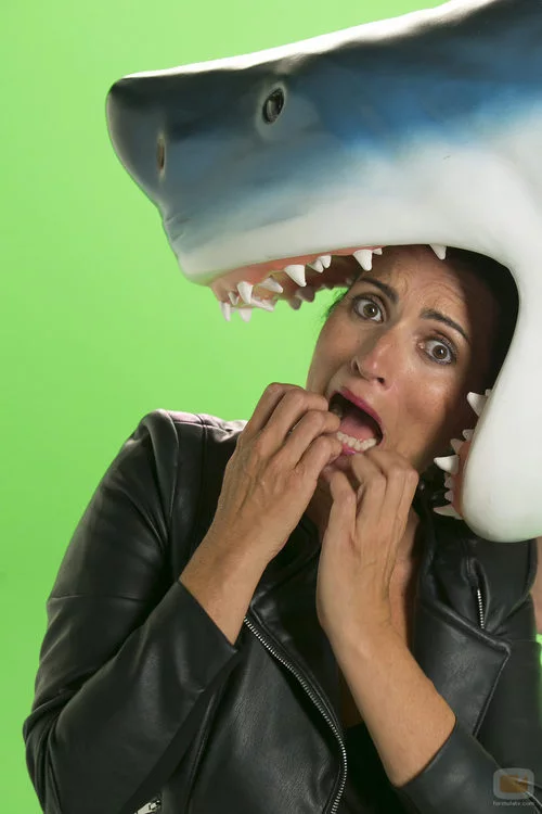 Silvia Abril se muestra aterrorizada porque su cabeza se encuentra dentro de la boca de un tiburón y está a punto de ser engullida en el 'casting' de "Sharknado 4".