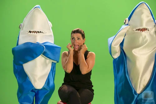Silvia Abril se muestra asustada y con una expresión de desespero al saber que dos tiburones se encuentran a su espalda en el casting de "Sharknado 4".
