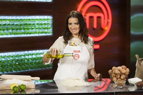 La actriz y humorista Silvia Abril ha posado en las cocinas de 'MasterChef Celebrity 2' y ha sostenido sobre sus manos una botella de aceite.