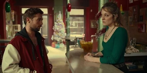 El actor Carlos Cuevas se dirige a su compañera Meritxell Calvo con seriedad, barra de bar por medio, en un local con decoración navideña en 'Smiley'.