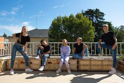 La representante de España en Eurovisión Junior 2020, Soleá, posa junto a sus bailarines: Lucía Arcos, Tania Gálvez, Carlos Damas e Iván Cuadros.