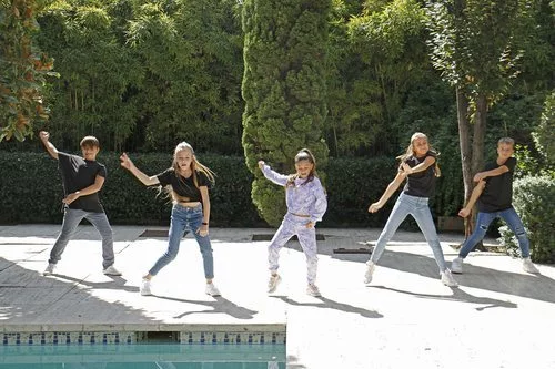 Soleá junto Lucía Arcos, Tania Gálvez, Carlos Damas e Iván Cuadros en el videoclip de "Palante", su canción para Eurovisión Junior 2020.