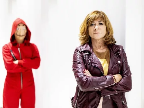 La principal responsable de ficción televisiva del grupo de San Sebastián de los Reyes posa junto a uno de los característicos personajes de 'La Casa de Papel', serie ganadora del premio Emmy Internacional 2018 al mejor drama.