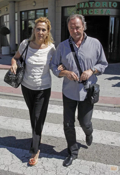 La colaboradora de Telecinco Rosa Benito y su marido, Amador Mohedano, a su llegada al tanatorio de Pedro Rodríguez, director general de Cuarzo.