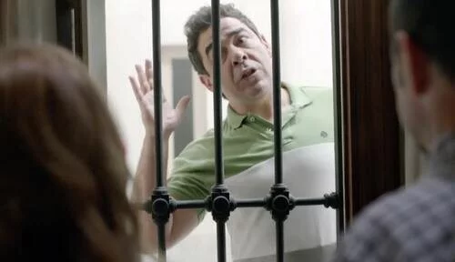 Pablo Chiapella saluda tras una ventana con rejas a Antonio Recio (Jordi Sánchez) y a Berta Escobar (Nathalie Seseña).