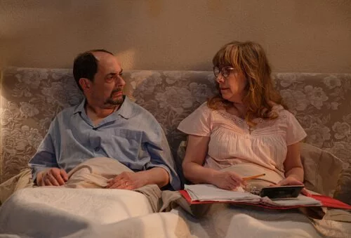 Antonio Recio y Berta Escobar charlan en la cama mientras ella repasa los folios de un archivador y él responde con gesto extrañado.