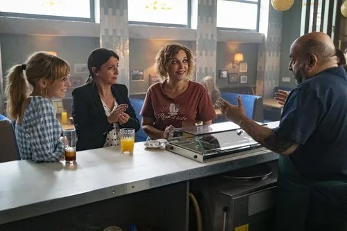 Laura (Cristina Plazas), María (Goizalde Núñez) y Bea Vargas (Lucía Caraballo) en el bar de Sebastián Rey (Jesús Castejón) durante la cuarta temporada de 'Estoy vivo'.