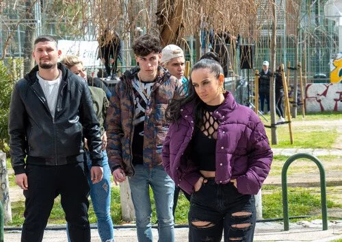 María de Nati continúa en la tercera temporada de 'Entrevías' interpretando a Nata, la pandillera de la serie de Alea Media. En la fotografía se la ve acompañada de más delincuentes del barrio.