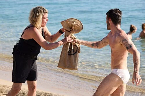 Los residentes de Playa Calma, Terelu y Pelayo, trabajando en equipo para intentar conseguir ganar la primera prueba de recompensa de 'Supervivientes 2025'.