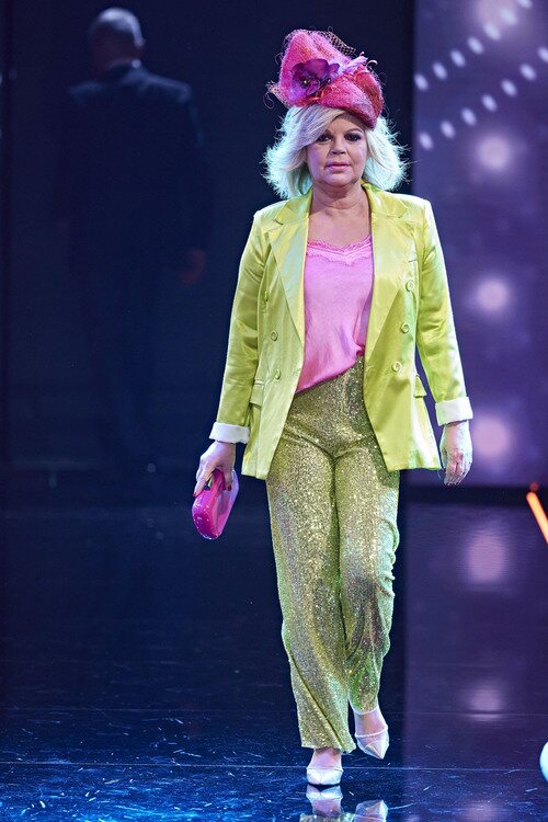 Con un traje que combina tonalidades amarillas y rosas, Terelu Campos desfila en la pasarela de 'Sálvame Fashion Week 2022'.