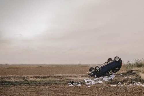 Un coche estrellado, con numerosos carteles de "Se busca" a su alrededor, aparece en medio del campo tras haber dado varias vueltas de campana.