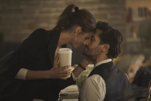 Amaia Salamanca (Sofía), y Juan Diego Botto (Sergio), en actitud cariñosa en la nueva serie de Movistar+ 'Todos mienten'.