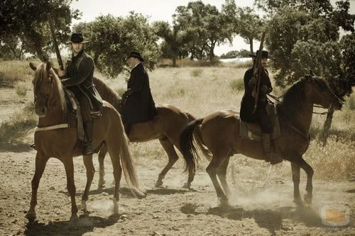 Aníbal (Antonio Velázquez), Lobo (Juan Fernández) y Fidel (Juan Codina) montán a caballo con sus rifles cargados.