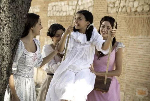 Rosa Lobo (Carla Díaz) se divierte en un columpio junto a sus hermanas en 'Tierra de lobos'.