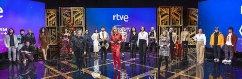 Eva Mora y María Eizaguirre, junto a los 13 aspirantes del Benidorm Fest