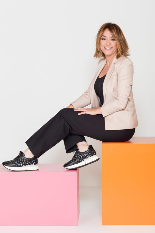 Toñi Moreno, presentadora de 'Viva la vida' en Telecinco posa entre coloridos cubos y le da "vida" a su programa.