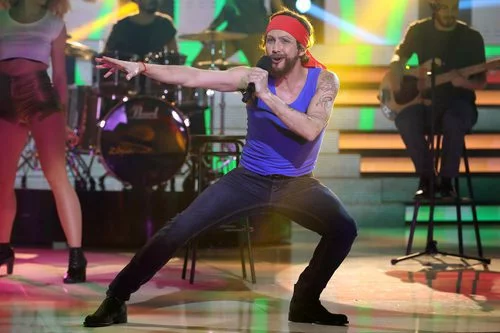El actor Canco Rodríguez es Macaco y canta su famoso tema "Moving" durante la decimotercera gala de 'Tu cara me suena'.