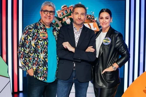 El presentador Frank Blanco posa junto a Florentino Fernández y Vicky Martín Berrocal, capitanes de los dos equipos en 'Typical Spanish', el nuevo programa de La 1.