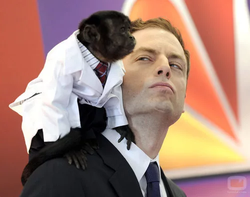 El mono Crystal y Justin Kirk en los Upfronts 2012 en NBC