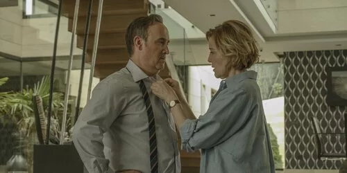 Juan Carrasco (Javier Cámara) y Macarena Lombardo (María Pujalte) se miran durante una de las escenas de 'Venga Juan', la comedia de HBO Max producida por 100 Balas.
