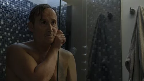 Juan Carrasco (Javier Cámara) reflexiona en la ducha sobre su futuro en uno de los capítulos de 'Venga Juan', la serie de HBO Max producida por 100 Balas.
