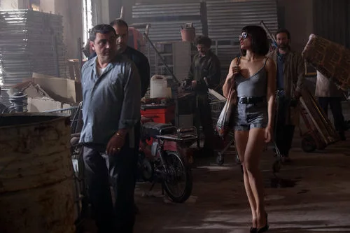 Carol pasa al lado de su novio Alfredo Medina "El Chatarrero", al que interpreta Paco Tous, y los socios de este en el primer capítulo de 'Apaches'.