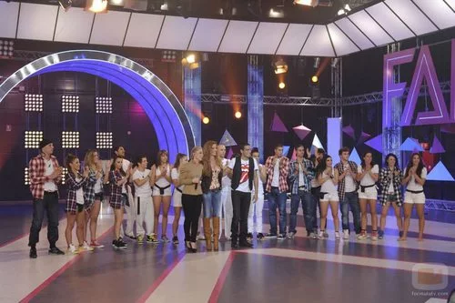 Soraya permanece en el escenario de 'Fama' junto a Paula Vázquez y los bailarines de 'Fama' tras finalizar su actuación.