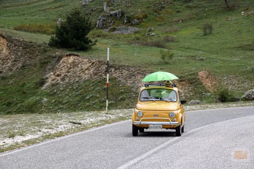 Frank Cuesta montado en un pequeño fiat camino del pueblo de Cocullo en el pirineo italiano, donde acudirá a la fiesta de las serpientes.
