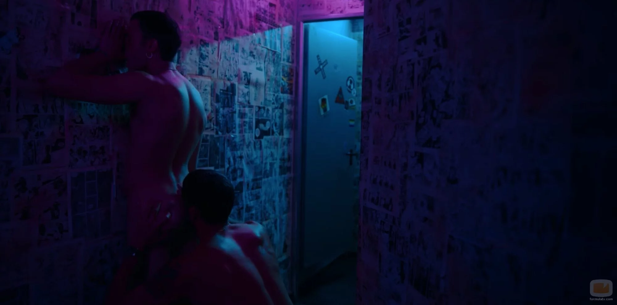 En esta escena sexual de 'Sagrada familia' el personaje de Álex García besa el culo del de Iván Pellicer en el cuarto oscuro.