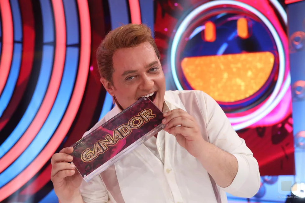 El ganador German Scasso mordiendo su premio de ganador en la gran gala final de 'Tu cara no me suena todavía'.